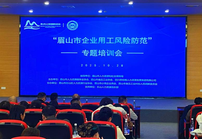 为积极响应眉山市“助企纾困、优化营商环境、推动产业高质量发展”的号召,切实解决我市食品企业在劳动用工方面的痛点、难点问题,眉山市食品工业协会联合眉山市人力资源服务业协会共同主办的“眉山市企业用工风险防范专题培训会”于2025年10月28日下午成功举行。本次培训会吸引了来自协会会员单位及市内相关企业的100余位企业负责人、人力资源及法务管理人员齐聚一堂,学习探讨企业合规用工之道。